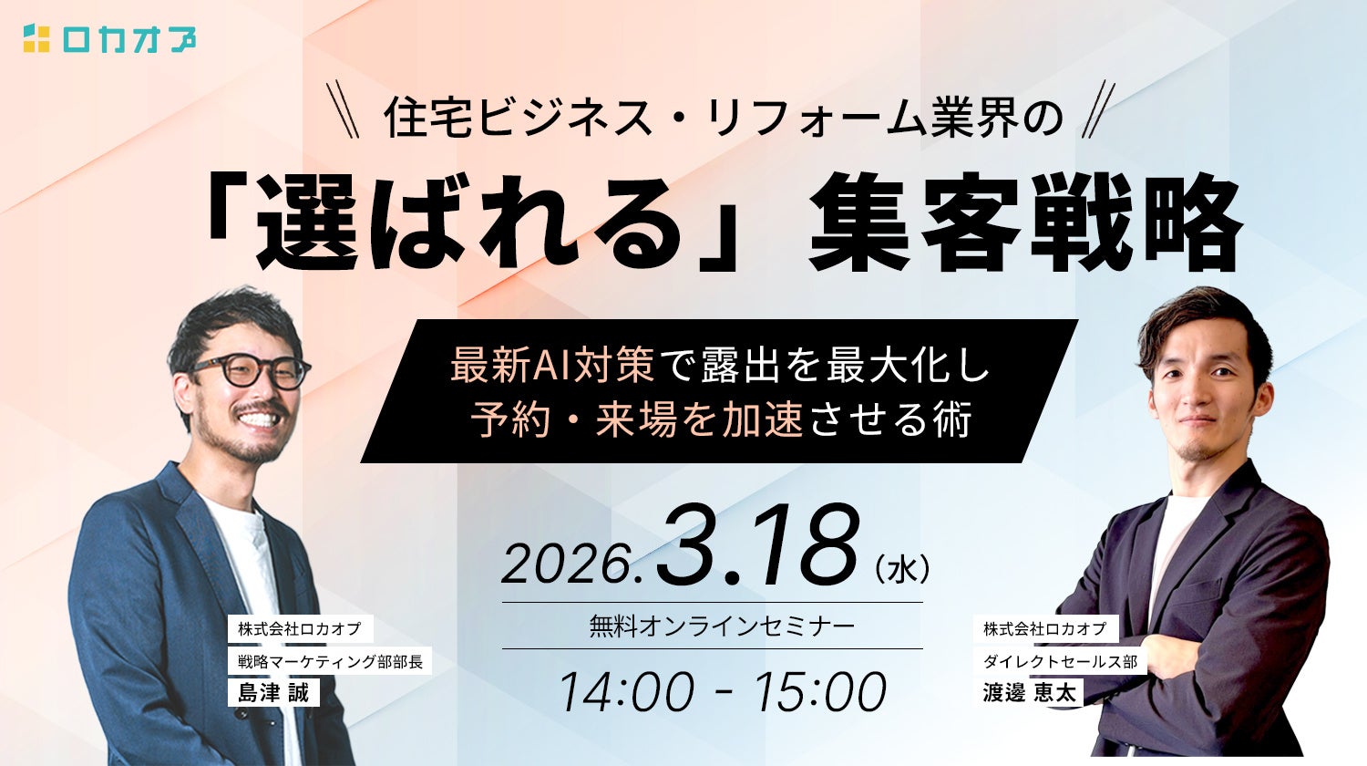 株式会社ロカオプ(本社:東京都新宿区新宿 代表取締役:縣将貴、以下:ロカオプ)は、3月18日(水)14:00より無料のオンラインセミナー『Instagram×Google AI(GEO)で勝つ!住宅ビジネス・リフォーム業界の「選ばれる」集客戦略 ~最新AI対策で露出を最大化し、予約・来場を加速させる術~』を開催いたします。