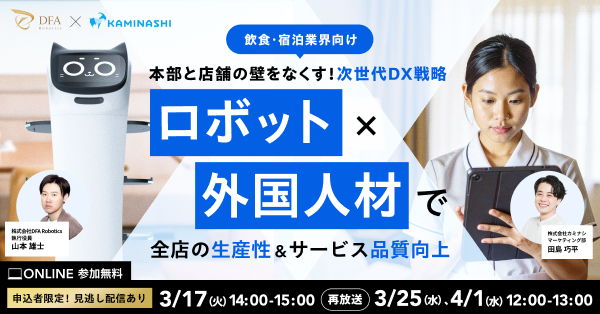 現場DXプラットフォーム『カミナシ』シリーズを提供する株式会社カミナシ(本社:東京都千代田区、代表取締役CEO:諸岡 裕人、以下「カミナシ」)は、株式会社DFA Robotics(本社:東京都港区、代表取締役社長:松林 大悟)と、2026年3月17日(火)に、飲食・宿泊業界の経営層や店舗運営責任者を対象としたオンラインセミナー「本部と店舗の壁をなくす! 次世代DX戦略 ~ロボット活用×多国籍人材活躍で全店の生産性とサービス品質向上~」を開催します。(参加費無料・事前登録制)