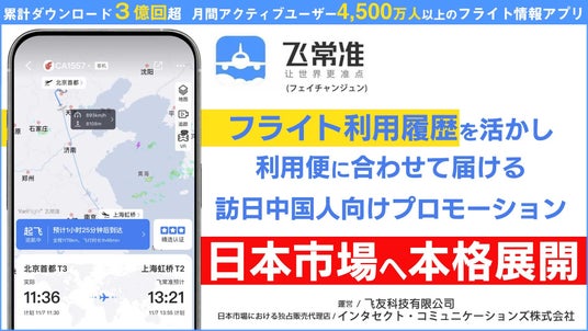 DXや訪日誘客支援、キャッシュレス決済領域を中心に事業を展開するインタセクト・コミュニケーションズ株式会社(本社:東京都千代田区、代表取締役社長:譚 玉峰、以下当社)は、飞友科技有限公司(本社:中華人民共和国合肥市、法廷代表人:郑洪峰)が運営する中国大手フライト追跡アプリ「飛常准(VariFlight)」の日本市場における独占販売代理店契約を締結し、2026年春より本格的に提供を開始いたします。