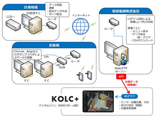 坂田電機株式会社(東京都西東京市:代表取締役 坂田 進、以下「坂田電機」)、株式会社コルク(東京都豊島区:代表取締役 堤 正雄、以下「コルク」)の両社は、坂田電機が提供する計測機器で取得した計測データを、コルクが提供するBIM/CIMクラウド「KOLC+」にAPI連携し、デジタルツイン上に3Dグラフとしてダッシュボード表示可能になったことをお知らせいたします。
