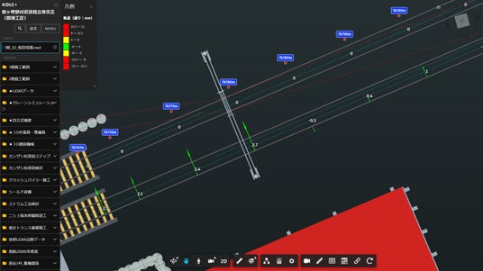 清水建設が施工を担当する「相模鉄道本線 鶴ヶ峰駅付近連続立体交差工事 第1工区」では、坂田電機の山留計測、軌道変位計測、軸力計、水盛式沈下計、傾斜計などが導入されており、それらをKOLC+のデジタルツイン現場にAPI連携し、リアルタイムに可視化しています。