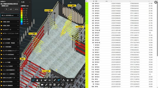 坂田電機の「DABROS」は、建設現場や防災現場などで計測されたデータを、インターネット経由でリアルタイムに確認・管理できるWebデータ閲覧システムです。主にダム、トンネル、地すべり観測、山留め工事などの土木・建築現場で利用されており、現場に行かなくても事務所や外出先から状況を把握できるのが大きな特徴です。今回、DABROSに実装されたAPIを用いることで、蓄積された計測データをKOLC+のデジタルツイン上にリアルタイムに転送して可視化できるようになりました。センサー機器の設置位置や方向、閾値に応じた色分けなどはKOLC+の「3Dグラフ」で設定でき、現場構成に合わせた柔軟な可視化が可能です。