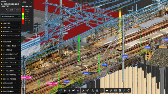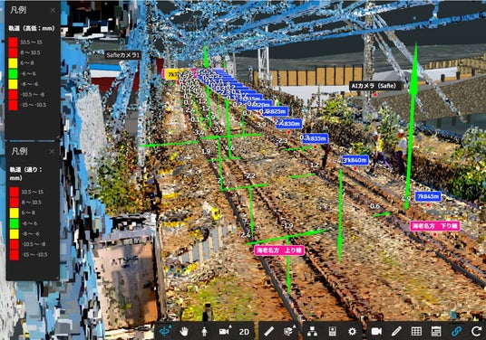 軌道変位(高低)の3Dグラフ。BIM/CIMモデル、点群、距離標とともに統合表示している