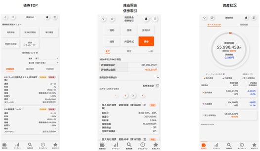 具体的には、現在はPCサイトでのみお取引いただいている債券(国内債券、外国債券、個人向け国債)について、本アプリからもお取引いただけるようになります。新設される「債券TOP」ページでは、「残高照会」をはじめ、「注文・約定履歴」「取引履歴」「受渡方法設定」「投資シミュレーター」などをご確認いただけます。また、「資産状況」ページにおけるすべての金融商品の「資産評価額」に、債券の保有残高・評価額が反映されるようになります。