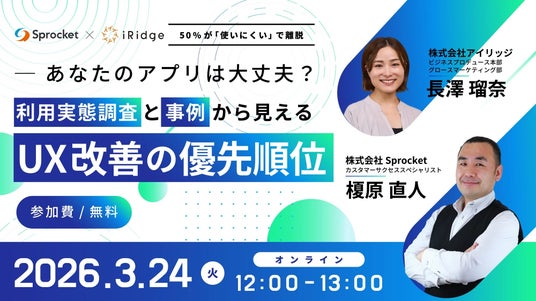 CX改善プラットフォームを提供する株式会社Sprocket(本社:東京都品川区、代表取締役:深田 浩嗣)は、株式会社アイリッジ(本社:東京都港区、代表取締役社長:小田 健太郎)と共同で、2026年3月24日にオンラインセミナー「あなたのアプリは大丈夫?利用実態調査と事例から見えるUX改善の優先順位」を開催します。