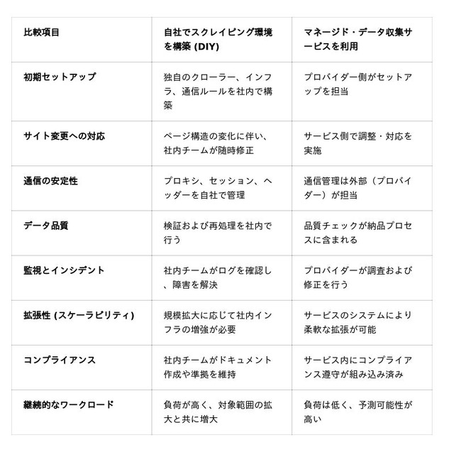 - 社内エンジニアをクローラーのメンテナンスではなく、AI開発や分析業務にシフトさせたい場合。