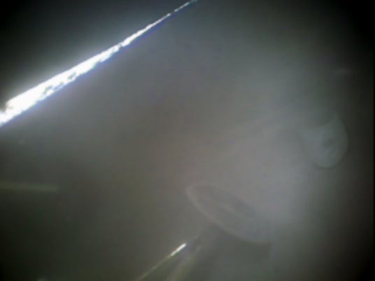 YAOKI搭載カメラによる月面での撮影(2025年3月7日) ※左上: クレーターの縁(リム) 中央下:月着陸船の脚部 画像補正したもの