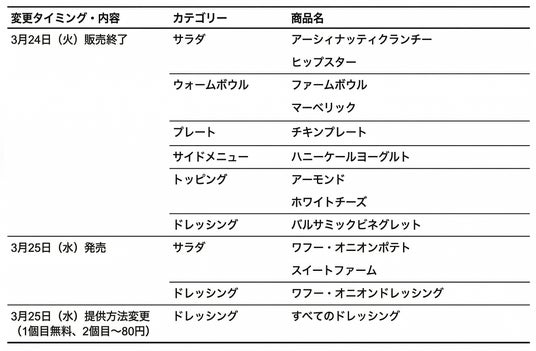 3月24日(火)をもって「ヒップスター」「ファームボウル」などを含むサラダ、トッピング、ドレッシング等の販売を終了します。これまで多くのお客様から人気があった商品も含まれますが、今後は期間限定商品としての再登場なども検討しています。