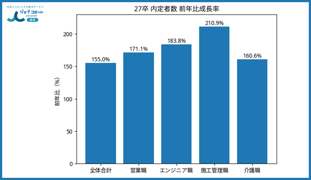 全体の成長率: 内定者数(実人数)は前年比155.0%と大幅に伸長。