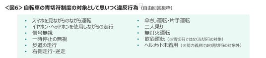 その他「信号無視」「一時停止の無視」「傘さし運転・片手運転」「二人乗り」「無灯火運転」といった通行ルール違反や周囲への安全配慮を欠く回答もみられた。また、赤切符の対象となる「飲酒運転」や努力義務である「ヘルメット未着用」を対象と誤認している回答も一定数みうけられた。<図6>