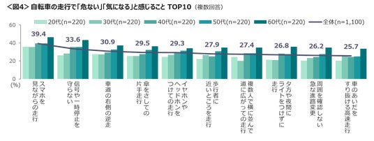 危ない・気になると感じる自転車の走行は、「スマホを見ながらの走行」「信号や一時停止を守らない」「車道の右側の逆走」がTOP3。