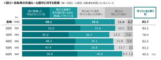 自転車の交通ルールは「守っていると思う」が83.7%で、そのうち「常に意識して守る」は48.1%。