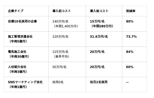 導入前の採用コスト50万円/名が、導入後は20万円/名に。コスト削減率は60%を記録した。