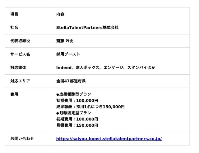 こうしたAI協働の流れのなかで、採用支援専門のStellaTalentPartners株式会社が提供する「採用ブースト」は、Indeed、求人ボックス、エンゲージ、スタンバイなど複数の媒体に対応し、掲載開始から平均14日で採用成果を実現する運用体制を構築している。