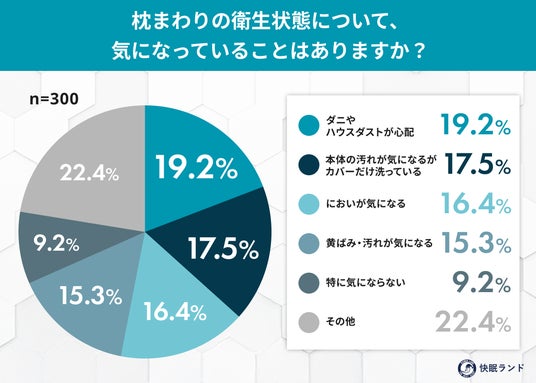 - 気になる悩みは「ダニ・ハウスダスト(19.2%)」「枕本体の汚れ(17.5%)」「ニオイ(16.4%)」が上位