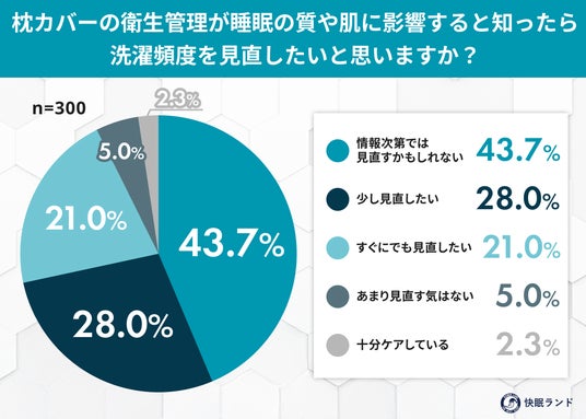 質の高い睡眠への関心が高まる中、見落とされがちなのが「枕カバー」の衛生状態です。私たちは毎日数時間を枕の上で過ごしますが、その汚れが睡眠の質や肌トラブルに与える影響は意外にも知られていません。快眠グッズ紹介サイト「快眠ランド」を運営するムーンムーン株式会社は、全国の20~60代男女300名を対象に「枕まわりの衛生習慣と睡眠に関する意識調査」を実施。 その結果、枕カバーを週に1回以下しか洗わない層が約7割(69.1%)にのぼり、さらに約半数(46.4%)が2週間以上洗濯していないという実態が浮き彫りになりました。一方で、適切なケアが睡眠や肌に良いと知れば、9割以上(92.7%)が「洗濯頻度を見直したい」と回答しており、衛生意識と行動のギャップが明確になっています。