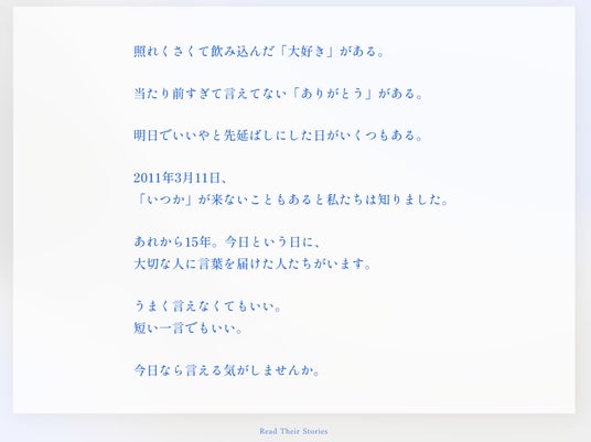 3月10日19時のサイト公開直後から、サイト上では今そばにいる家族、もう会うことのできない大切な人など、さまざまな相手に宛てた「今日だからこそ伝えたい言葉」が絶え間なく寄せられています。サイト訪問者による寄せられたお手紙: 300件以上