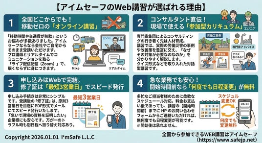 会場に出向かず、会社やご自宅で講習が受けられるメリットがあり、受講者の方の負担が軽いというのもアイムセーフが選ばれる理由です。
