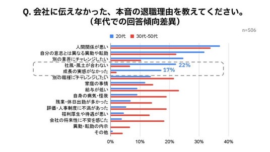■ 本音の退職理由として「社風・風土が合わない」「成長の実感がなかった」を挙げた20代はそれぞれ22%、17%(30代以上の8.5倍)に上る一方、30代~50代ではそれぞれ7%、2%と、世代間で大きな乖離があることがわかりました。20代の退職者が本音を会社に伝えない理由のトップは、「上司に話しても理解してもらえないと思ったから」(65%)でした。
