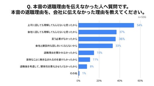 ■ 退職理由の本音を伝えなかった理由の最多は「上司に理解してもらえないと思ったから」(54%)であり、逆に退職理由の本音を伝えた理由の最多は「話を理解してくれる上司だったから」(56%)という結果でした。