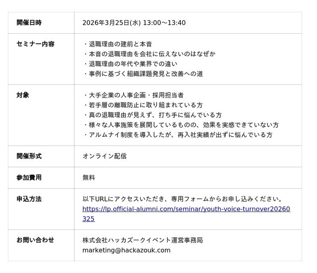 この問題の解決へのヒントとして、この度人事企画・組織開発ご担当者様向けに、退職者のリアルな声を経営資産に変え、強い組織づくりに活かすための具体策を解説するセミナーを開催いたします。貴社の組織課題の発見・改善に向けて、ぜひお申し込みください。