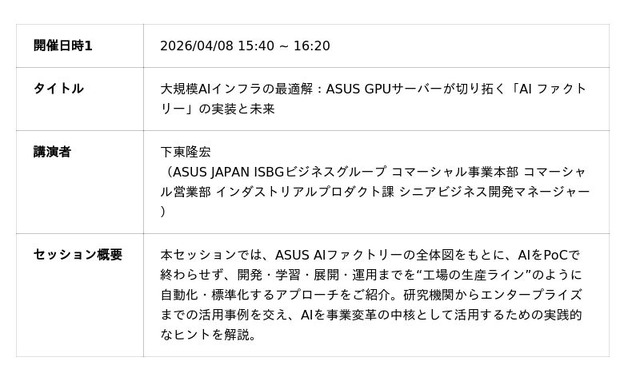 更に、会期中には、ASUSのAIインフラおよびエッジAIコンピュータシリーズを紹介する講演セッションも予定しています。