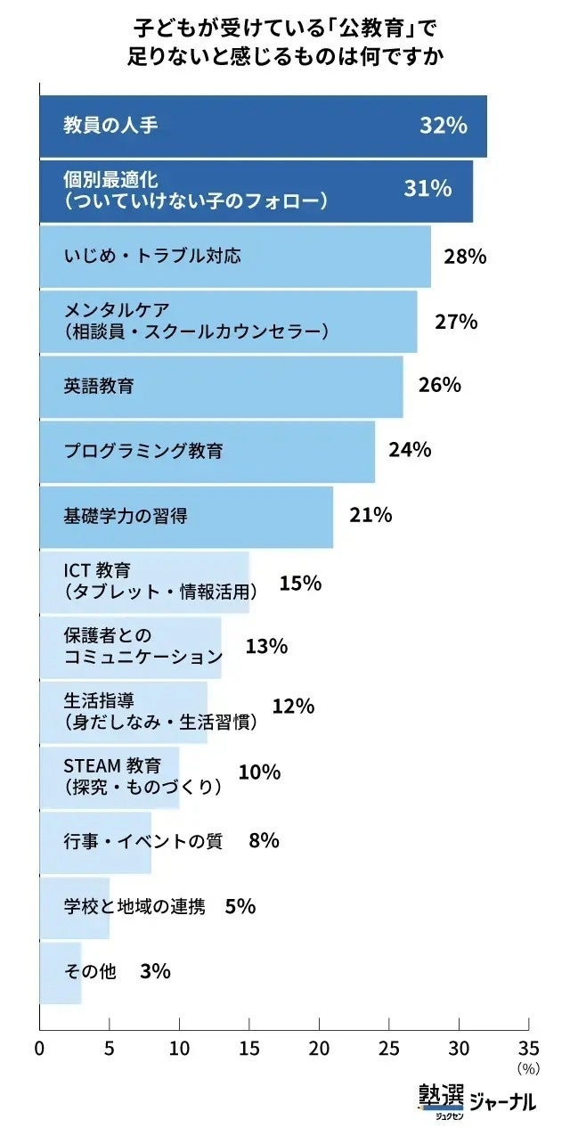 学習の物足りなさ、個別対応の不足、先端教育への遅れといった問題は別々のようでいて、根底では「教員が足りない」「余裕がない」ことにつながっていると考えられそうです。