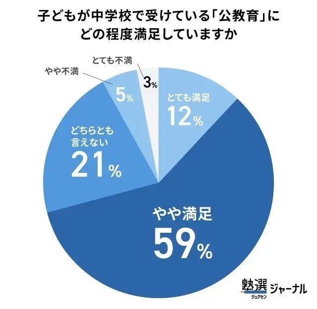 子どもが中学校で受けている公教育への満足度を尋ねたところ、「とても満足」(12%)と「やや満足」(59%)を合わせて、全体の71%が肯定的に評価していました。