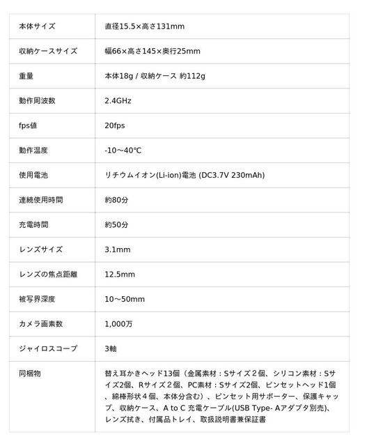 付属の多彩な耳かきヘッドには、耳垢を挟み取るピンセットヘッドも含み、かき出しにくい耳垢や汚れなどを取りやすくします。また、主な耳かきヘッドには、耳を傷つけにくいシリコン素材を採用し、レンズはIP67の防水・防塵性能のため、耳かきヘッドを水洗いすることができ、きれいに保つことができます。
