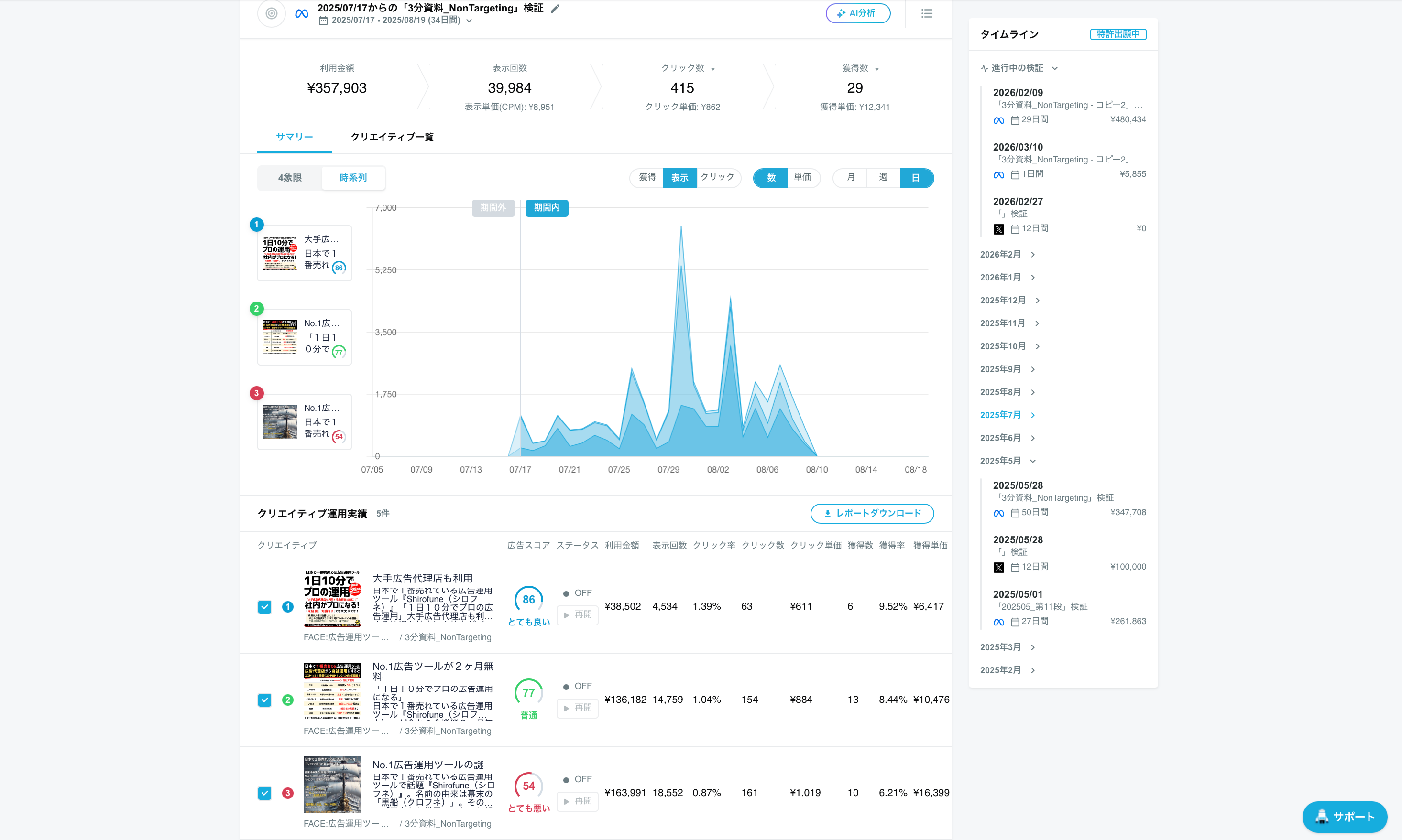 Shirofuneを通じて運用する全てのクリエイティブの検証期間ごとの配信結果を独自アルゴリズムで自動で一つのタイムラインにまとめ、各広告グループでクリエイティブごとに検証期間中の成果を比較。「4象限マトリクス」「時系列グラフ」「広告スコア」の3つで可視化し、結果の良し悪しを運用担当者は元より、数字に強くないクリエイターやデザイナーの方でも一目で直感的に確認できる状態へ自動でまとめます。また、画面上から手軽に停止/再開が可能です。
