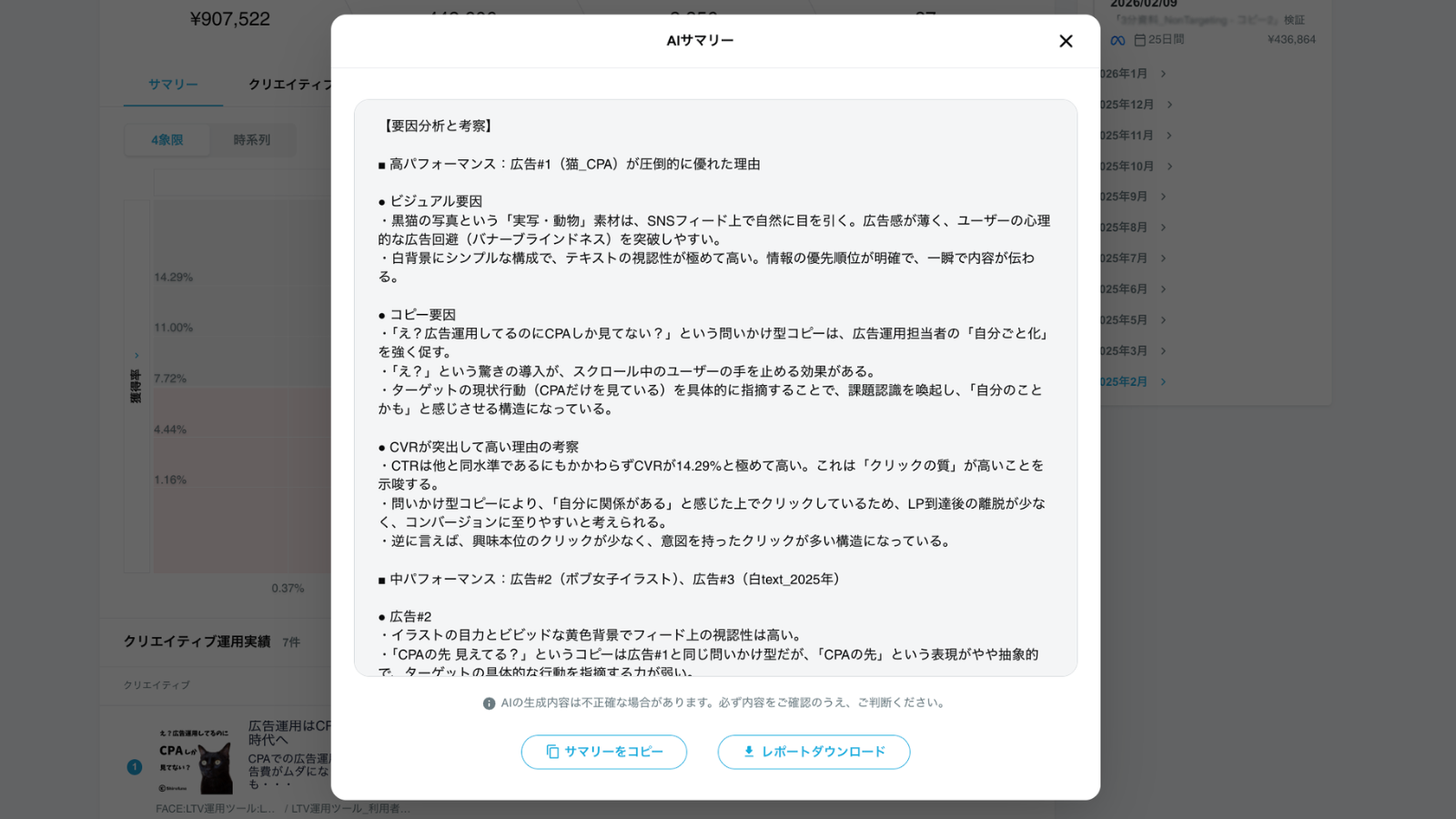 AIが高成果クリエイティブの特徴や成果要因を分析し、その結果をもとに次回制作の方向性や具体的な制作案まで提示します。運用者と制作チーム内での認識合わせや制作指示の工数を削減するとともに、属人的になりがちな振り返りや改善判断の平準化を促進し、成果共有や改善アクションを効率化し、改善サイクル全体のスピードと再現性を高めます。
