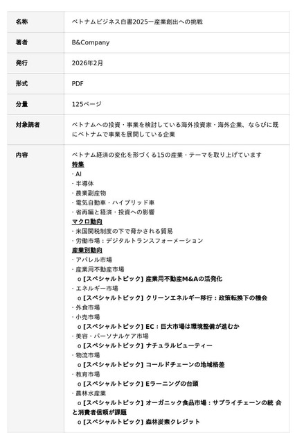 しかし実務の現場では、ベトナム投資に関する一般的な情報は豊富である一方、産業単位に降りてみると断片化しており、論点の軽重、業界横断のつながりなどを踏まえまとまった見方を得ることが難しいという課題がありました。こうした課題に取り組むため、当社は本書を刊行することと致しました。