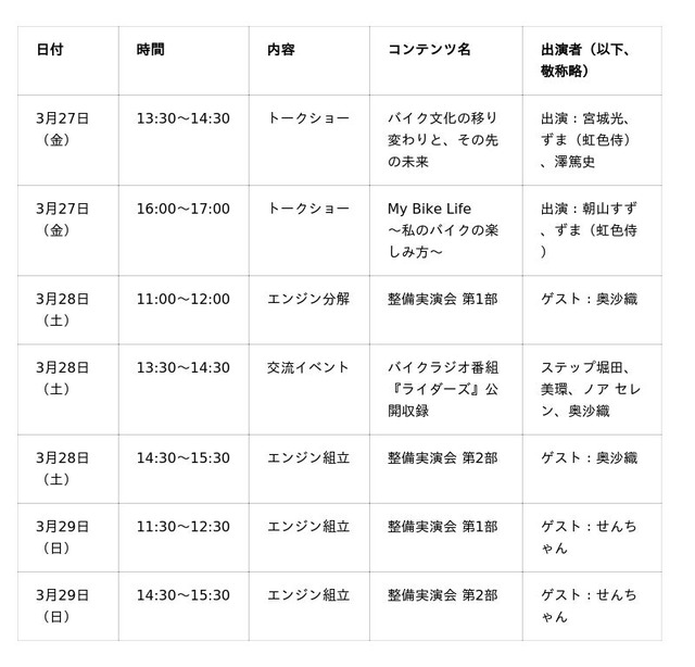 開催2日目および3日目には、バイク王の熟練整備スタッフによる整備実演パフォーマンスを2部制(各パート1時間)で実施します。
