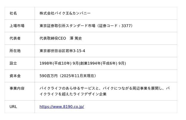 株式会社バイク王&カンパニーは、1994年9月に創業。中古バイクの買取・販売を主力事業とし全国に店舗を展開するほか、バイクの整備・パーツ販売・レンタルなど、バイクライフを総合的にサポートしています。近年は、バイクだけでなく電動モビリティなど、バイクライフを超えた幅広いモビリティ関連事業へと領域を拡大しています。