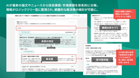 本機能は、AIが最新の論文やニュースから技術課題・市場課題を体系的に分解。ロジックツリー型のUIで視覚化し、業務特性に合わせた対話テンプレートを通じて、網羅的な解決策の検討を可能にします。
