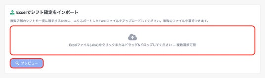 エクスポートしたExcelに人員調整などの手修正を加えた後、複数ファイルをドラッグ&ドロップでまとめてアップロード。ファイル名から対象店舗を自動判別し、店舗ごとの期間・シフト数・ステータスをプレビュー表示します。内容を確認したら「一括確定」ボタンで全店舗のシフトをまとめて保存できます。
