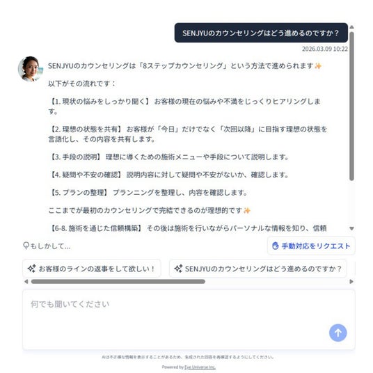 株式会社Eye Universeについて株式会社Eye Universeは、AI技術を活用して美容業界を含むさまざまな分野で顧客体験の向上を目指す先駆け企業です。美容業界における顧客体験の革新を通じて、新たな価値を創造し続けています。