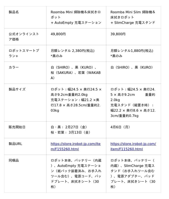 アイロボットジャパン合同会社(本社:東京都千代田区/代表執行役員社長 山田 毅)は、世界最小クラス(国内市場最小*1)のロボット掃除機「Roomba Mini 掃除機&床拭きロボット + AutoEmpty 充電ステーション」の桜(SAKURA)、若葉(WAKABA)の2色を、本日3月13日(金)より販売開始いたします。本製品は2月27日(金)に白(SHIRO)と黒(KURO)の販売を開始し、アイロボット公式ストアにおける事前予約において当初計画比の約4.5倍の受注を記録するなど、コンパクトなロボット掃除機を求める市場から大きな反響をいただいています。