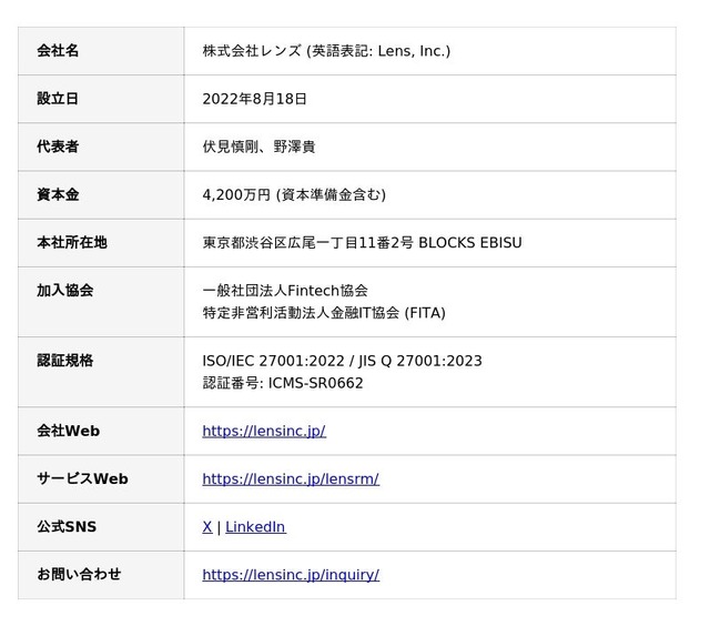 株式会社レンズは、ガバナンス・リスク・コンプライアンス・セキュリティの側面から企業活動を支えるソリューションを開発・提供しています。2025年2月にはシードラウンドで8.44億円の資金調達を発表しました。2023年8月より、委託先・サードパーティ管理を効率化・高度化するSaaS 「Lens RM」を提供開始。Lens RMは、外部委託先・再委託先やクラウドサービスの管理だけでなく、社内の部門やシステム・プロジェクトのリスク管理・内部統制にも対応しています。 管理プロセスのデジタル化とAIの利活用により、コスト削減とリスク管理の高度化を実現でき、金融機関ほか大手企業に導入されています。