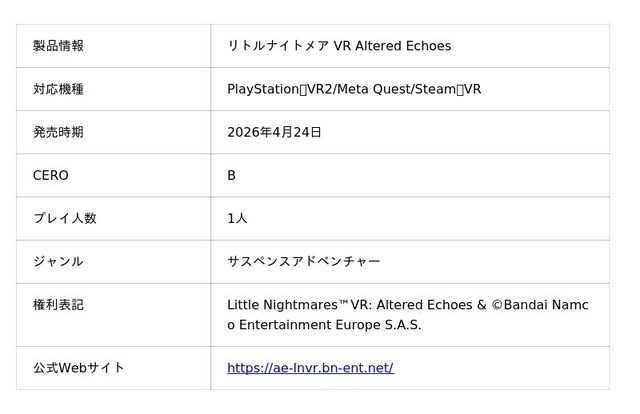 株式会社バンダイナムコエンターテインメントは、PlayStation(R)VR2/Meta Quest/Steam(R)VRで発売予定のサスペンスアドベンチャーゲーム『リトルナイトメア VR Altered Echoes(リトルナイトメア VR オルタード・エコーズ)』につきまして、2026年4月24日(金)に発売することを発表いたしました。