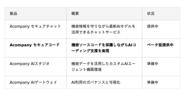 株式会社Acompany(アカンパニー、代表取締役CEO 高橋亮祐、以下Acompany)は、安全で秘密を守れるAI製品ブランド「Confidential AI Suite」の第二弾として、企業の機密ソースコードを保護しながらAIによるコーディング支援を受けられる「Acompany セキュアコード」のベータ版の提供を開始いたします。あわせて、先行導入企業の募集を開始いたします。