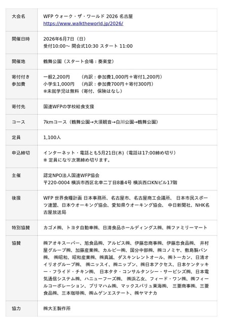 認定NPO法人国際連合世界食糧計画WFP協会(以下、国連WFP協会、神奈川県横浜市:安藤 宏基 会長)は、チャリティーイベント「WFPウォーク・ザ・ワールド 2026 名古屋」を6月7日(日) に鶴舞公園で開催 します。本イベントへの参加申込み受付を3月13日(金)より開始します。