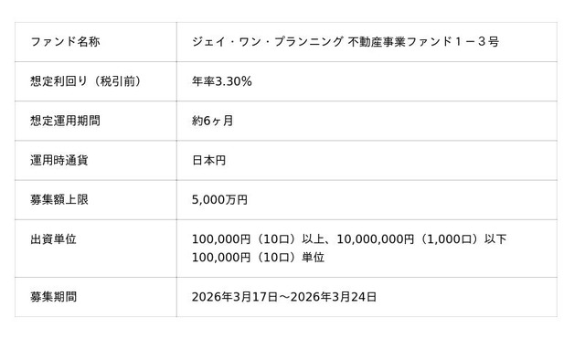 「未来をわかちあう投資」を提供する「Funvest(ファンベスト)」(以下、Funvest)は、「ジェイ・ワン・プランニング 不動産事業ファンド1-3号」(以下、本ファンド)の募集を3/17より開始しますので、お知らせいたします。