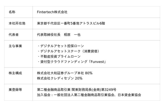 Fintertechは、大和証券グループ及びクレディセゾンがそれぞれ創業来培ってきた金融ビジネスのノウハウを礎としながら、最先端のテクノロジーの活用や外部企業との連携により次世代金融サービスを機動的にかつ柔軟に創出することを目指しています。 主な事業として、暗号資産を活用した「デジタルアセット担保ローン」及び「デジタルアセットステーク(消費貸借)」、「未来をわかちあう投資」を提供する貸付型クラウドファンディングサービス「Funvest(ファンベスト)」を展開しています。