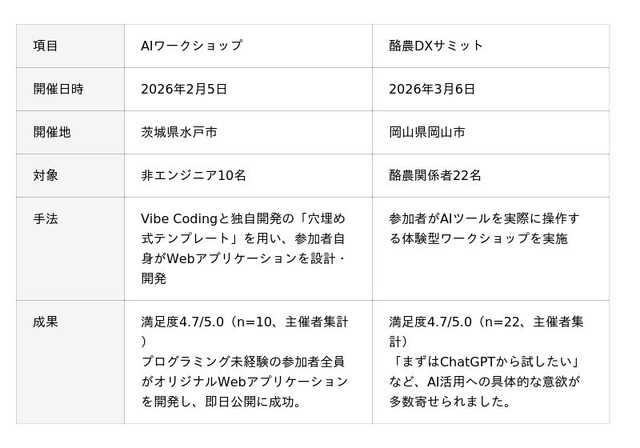 Metagri研究所は、2026年2月~3月にかけて2つの現場でAI活用ワークショップ(※3)(※4)を実施し、いずれも高い成果と満足度を記録しました。