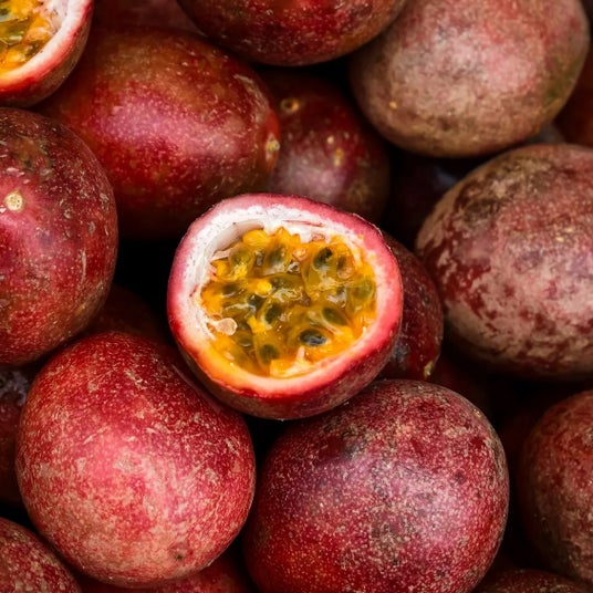 奄美大島で、たった一人で農薬を使用せずにパッションフルーツを育てている農家さんのもとを代表の勝田が訪ね、皮に少し筋が出て出荷しないけれど、香りは素晴らしい加工用のものを使わせていただくことに。中の種と果肉を取り除き、外皮を蒸留して抽出した蒸留水と、乾燥させた種を低温圧搾した種子オイルを配合しました。