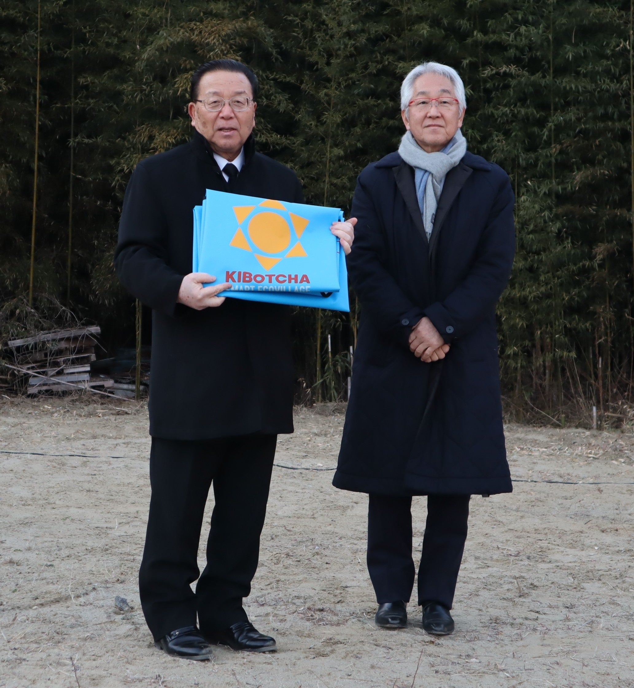 贈呈は、毎年「KIBOTCHA」で開かれている東日本大震災の慰霊祭の場において執り行われました。エプロン制作パートナーである株式会社ライト・ウィズアウト・ヒート、株式会社服部、株式会社ネクストマップの代表にもお越しいただき、地域の方や「KIBOTCHA」を運営する貴凛庁株式会社、宮城沿岸で牡蠣養殖を営む地元企業の方に見守られる中、渥美 巌東松島市長へ手渡しました。