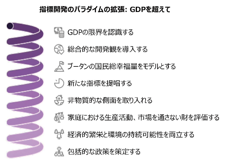 SDGs の達成や国家レベルの発展を評価するために、GDP などの定量的指標に依存する現在のアプローチには問題があります。この方法では、人間と社会の繁栄を理解し、促進する範囲が著しく制限されます。真の発展は、経済成長や物質的な豊かさだけでなく、感情的な幸福、文化的および言語的な豊かさ、心理的、宗教的、精神的、感情的な充足といった非物質的な次元も含むべきです。これらの側面は、多くの場合、質的で動的な性質を持ち、従来の測定フレームワークでは捉えきれませんが、進歩や幸福を包括的に理解するために極めて重要です。そのため、GDP や類似の指標の限界を超えて、人間の経験と社会的健康の全体像を捉える幅広い包括的な指標を含む指標開発のパラダイムを拡張する必要があります。GDP 中心の指標の限界を克服するために、非物質的な発展の側面をより正確に反映する新しい指標を開発し、統合することが求められます。これらの指標は、地域社会の結束、文化的および言語的活力、環境保全、個人および集団の幸福感といった特性を捉えることを目指すべきです。さらに、家庭における生産活動や市場を通さない財を経済指標に組み込むことが重要です。それによって、真の経済活動を反映させ、量的な基準のみならず質的な結果を強調しながら、物質的および非物質的な繁栄の両方を評価するバランスの取れたフレームワークが提供できます。