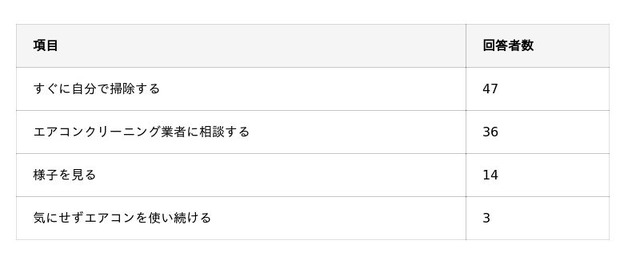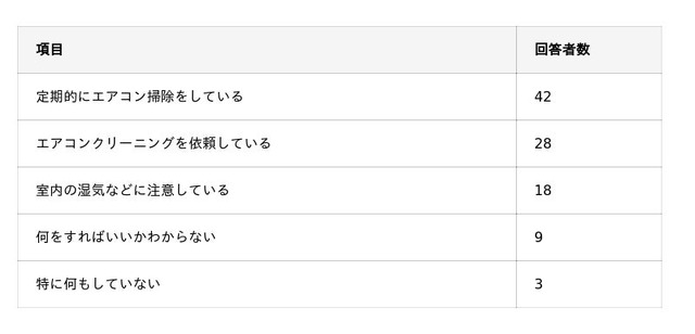 - エアコンのカビ対策として実施していることは「定期的なエアコン掃除」や「エアコンクリーニングの依頼」。