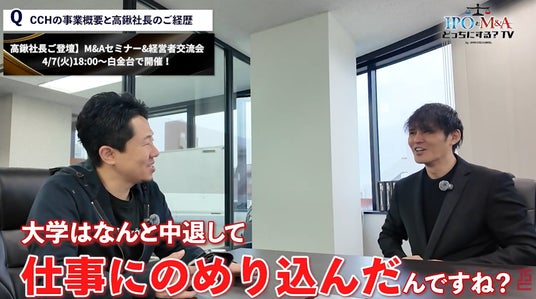 YouTubeチャンネル「Japan Stock Channel」を運営する株式会社IR Robotics(本社:東京都千代田区、代表取締役:金 成柱)は、人気コーナー「IPOとM&Aどっちにする?TV」にて、CCH(旧シティクリエーションホールディングス)代表取締役の高鍬 仁一氏をゲストに迎えた最新動画を公開いたしました。
